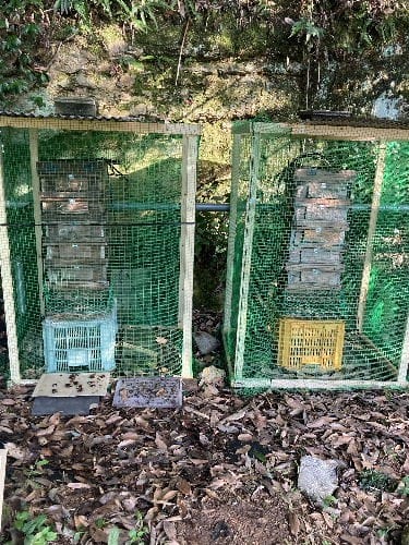 オオスズメバチ対策で、ミツバチの巣箱をネットですっぽり覆いました。
