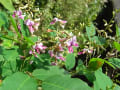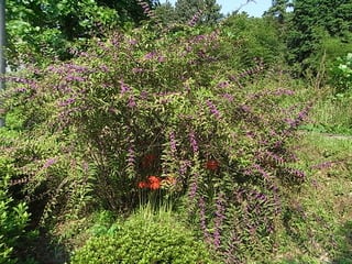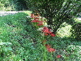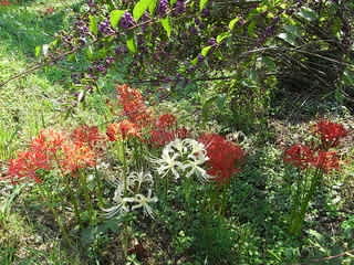 彼岸花に覆いかぶさるようにコムラサキ(小紫)の大きな株。