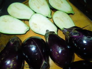ナスを半分に切り、縦にいくつかに切り分けます。