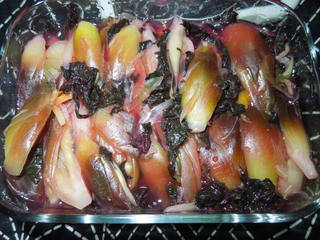 この時点で色がちょっと抜けますが、酢につけると発色して赤くなります。