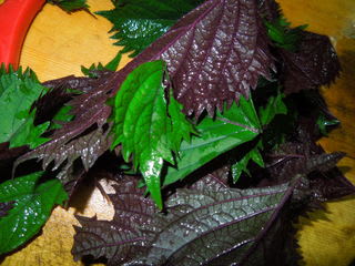 芳香ウラ紫蘇(赤紫蘇)を二本ほどとってきて、少量の塩でもみます。