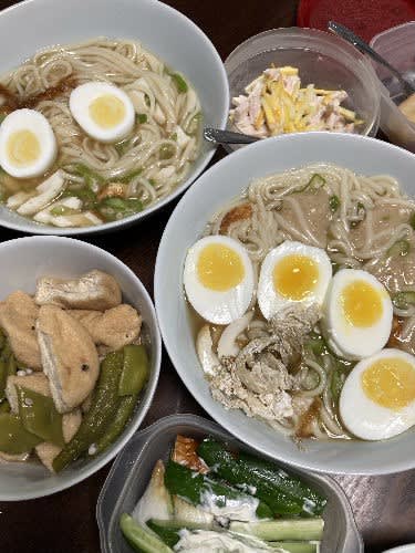 今朝は、にゅう麺にゆで卵をのせて、たっぷりのオクラでとろみをつけました。