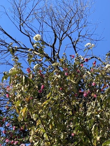 見上げると、季節外れのオオデマリの白い花も咲いています。