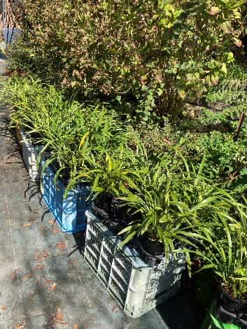 ブドウの棚の下に置いてあるキンリョウヘンの鉢を、