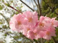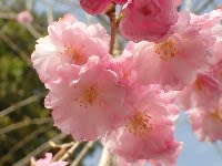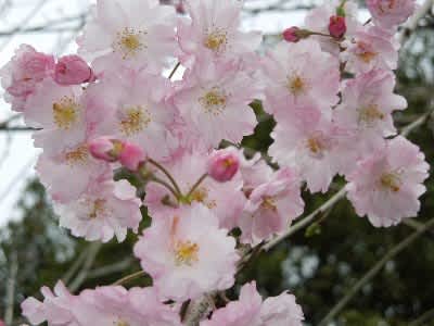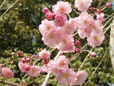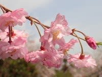 ピンクの八重の花が長い枝にしだれて咲く、優美な桜です。