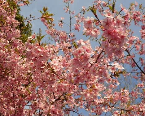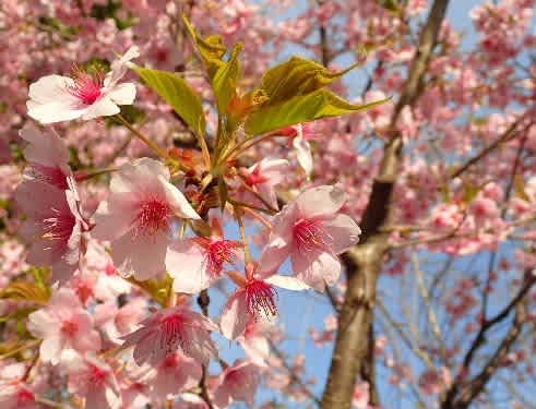 花といっしょに葉が出る河津桜。